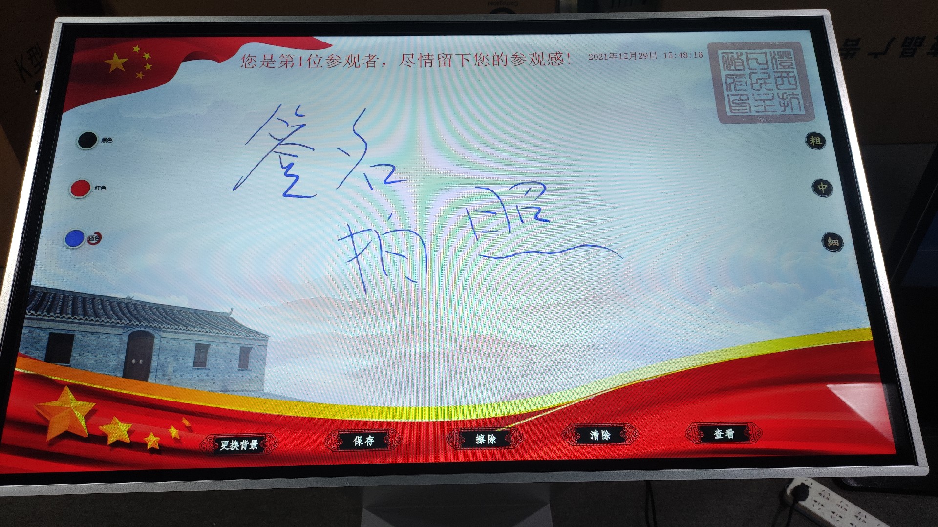 電子拍照運用數字簽名、影像捕捉、影像合成、大屏顯示、信息統計、互動抽獎、實時打印等技術融為一體??蓪崿F高清拍照、手寫簽名、智能領座、大屏展示、互動抽獎和統計瀏覽功能。來訪者可以在液晶屏上進行自由的書寫,發表參觀感言、提寫寶貴意見、留下紀念。內容由多媒體留言板以錄屏模式記錄存儲,使參觀者寫畫在觸摸屏上的任何文字、圖形以及拍攝的圖片都可以被保存至硬盤存儲設備,可在后臺查詢、瀏覽。